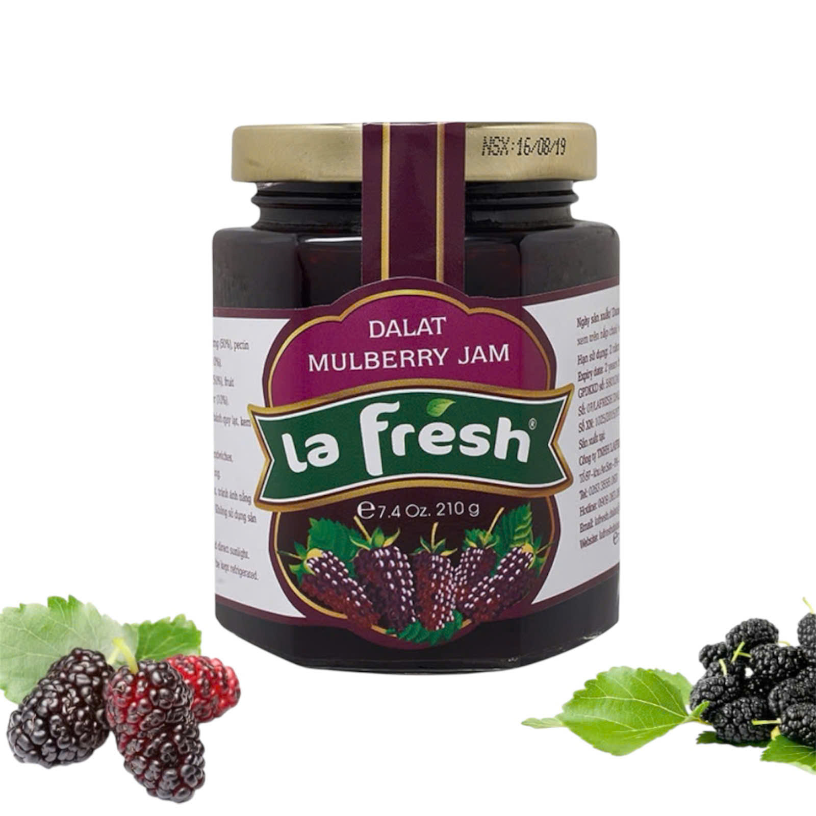 - Thành phần: Dâu tằm, đường mía, nước, pectin (chất tạo gel tự nhiên), chất bảo quản Kali Sorbat (E202).